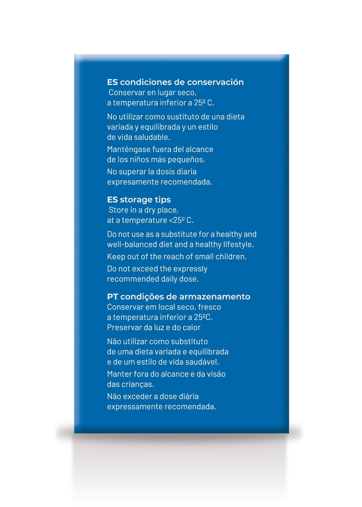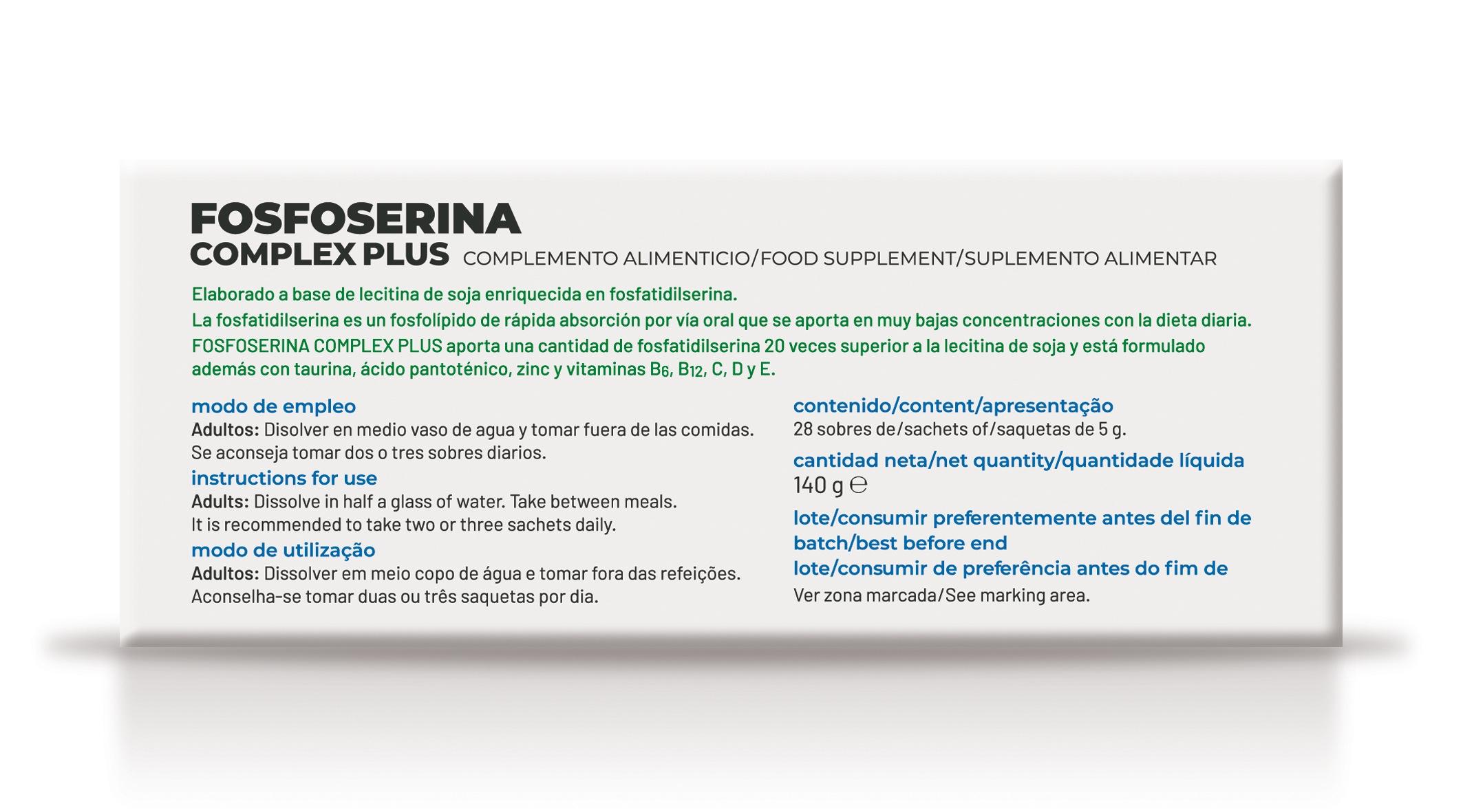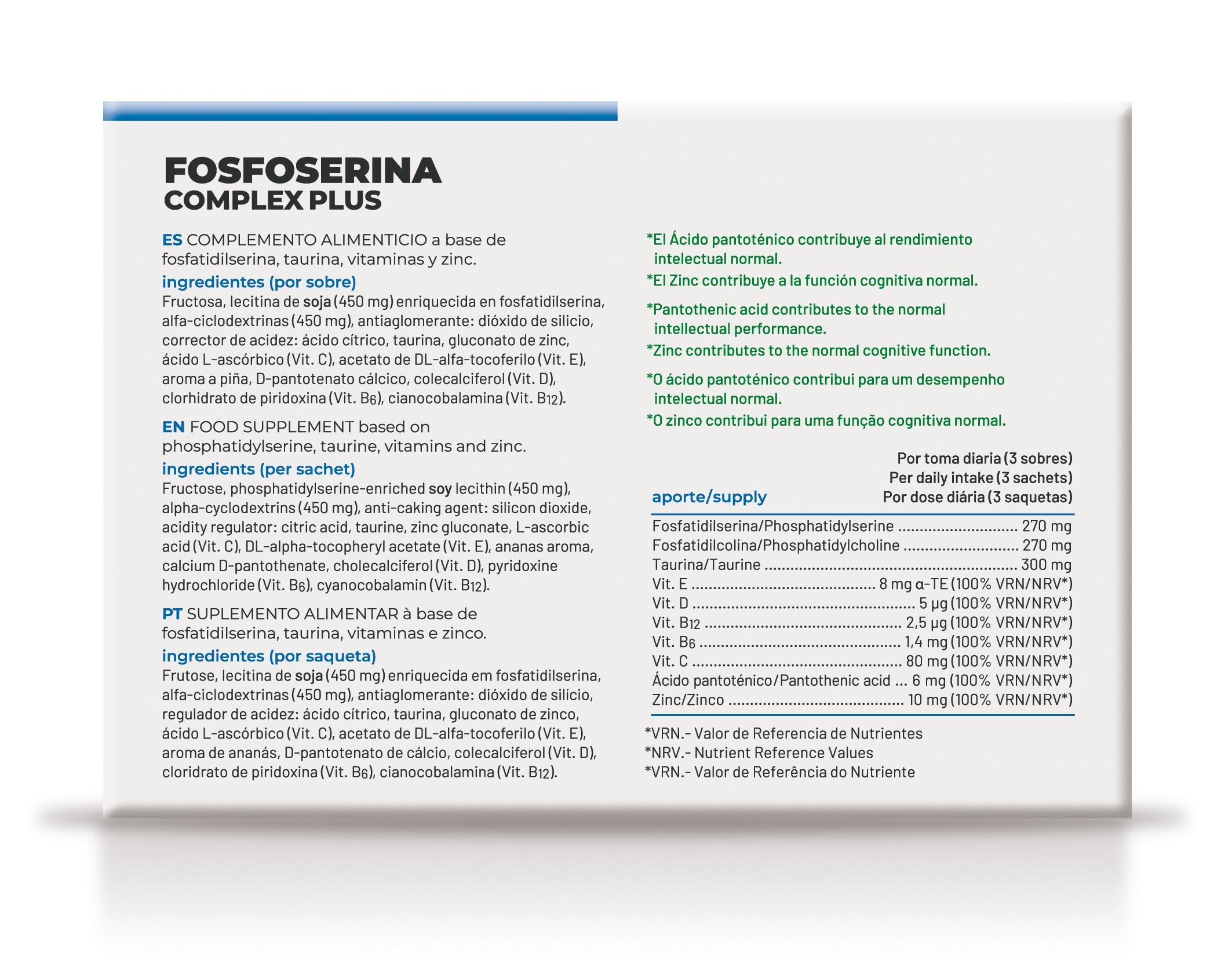 Por sobre: fructosa, lecitina de soja (450 mg) enriquecida en fosfatidilserina, alfa-ciclodextrinas (450 mg), antiaglomerante: dióxido de silicio, corrector de acidez: ácido cítrico, taurina, gluconato de zinc, ác L-ascórbico (Vit. C), acetato DL-alfa tocoferilo (Vit. E), aroma a piña, D-pantotenato cálcico, colecalciferol (Vit. D), clorhidrato de piridoxina (Vit. B6), cianocobalamina (Vit. B12).